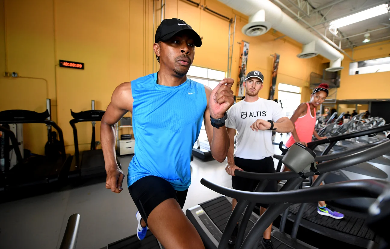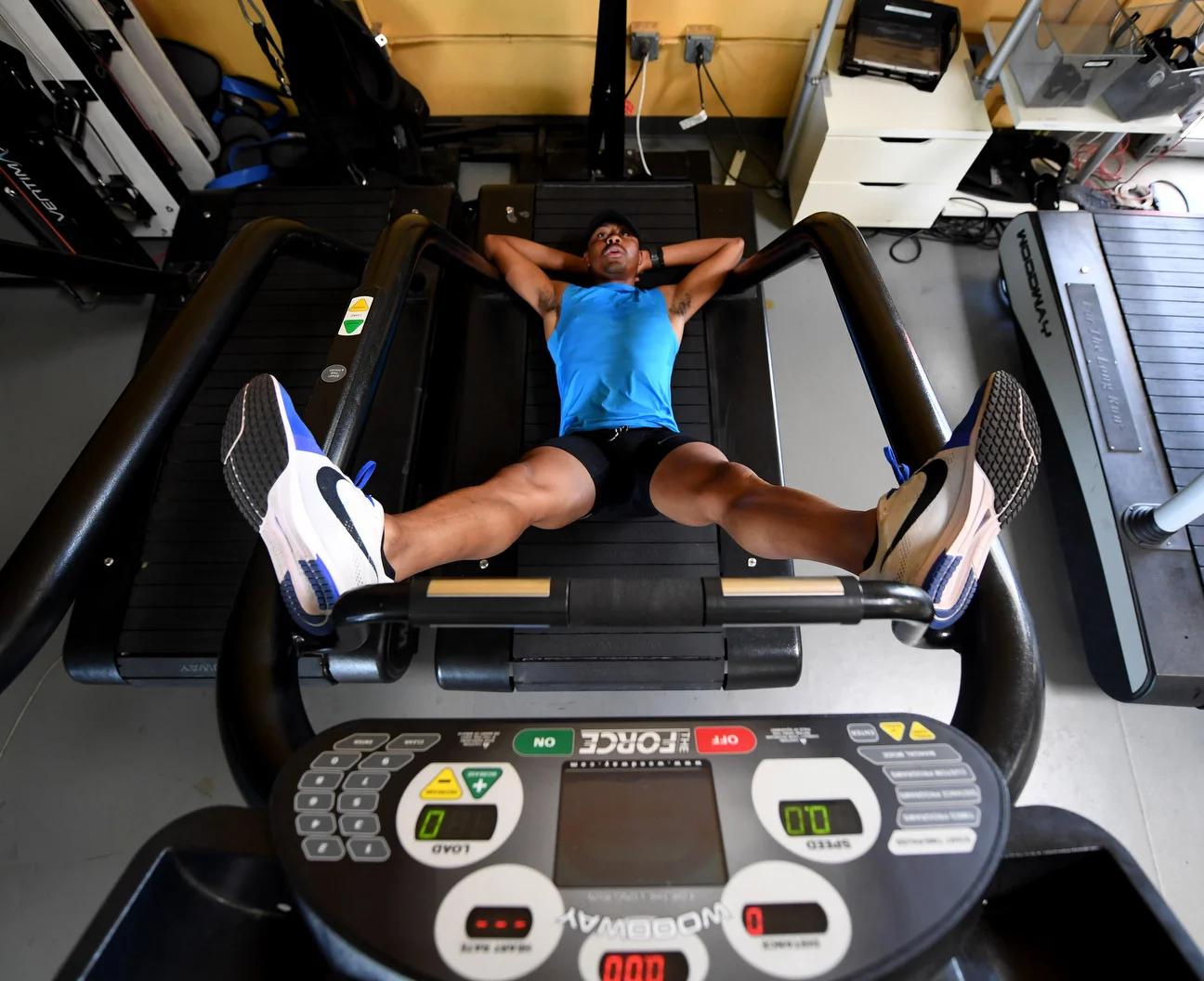 If anyone deserves a relaxing cooldown, it's Merritt, seen here stretching out on a treadmill at the EXOS facility in Scottsdale, Arizona. The Olympic athlete underwent a kidney transplant last September.