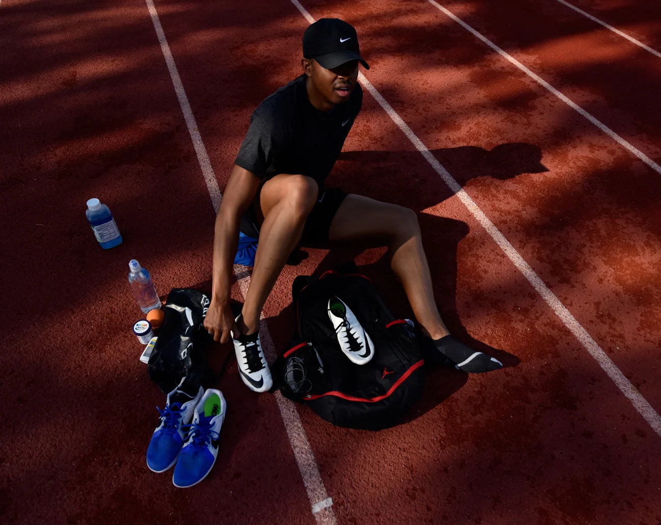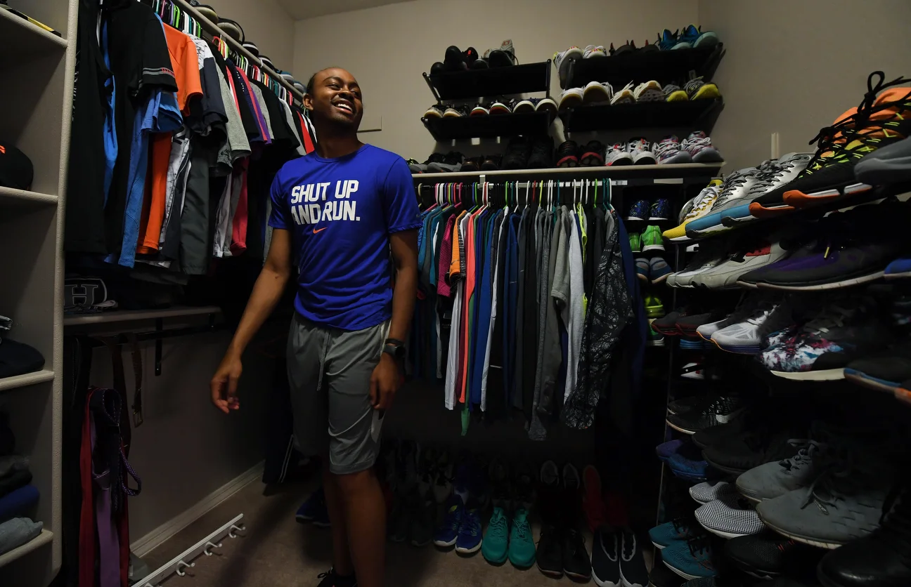 It's not surprising that someone who is a gold-medal hurdler would have a lot of shoes and Merritt keeps his gear nicely organized.