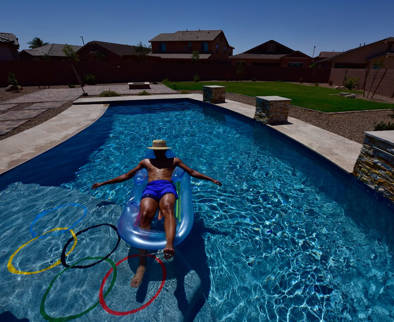It's easy to see the Olympic rings painted on the bottom of Merritt's pool. Look a little more closely, and you might see the scar left on his abdomen from his kidney transplant.