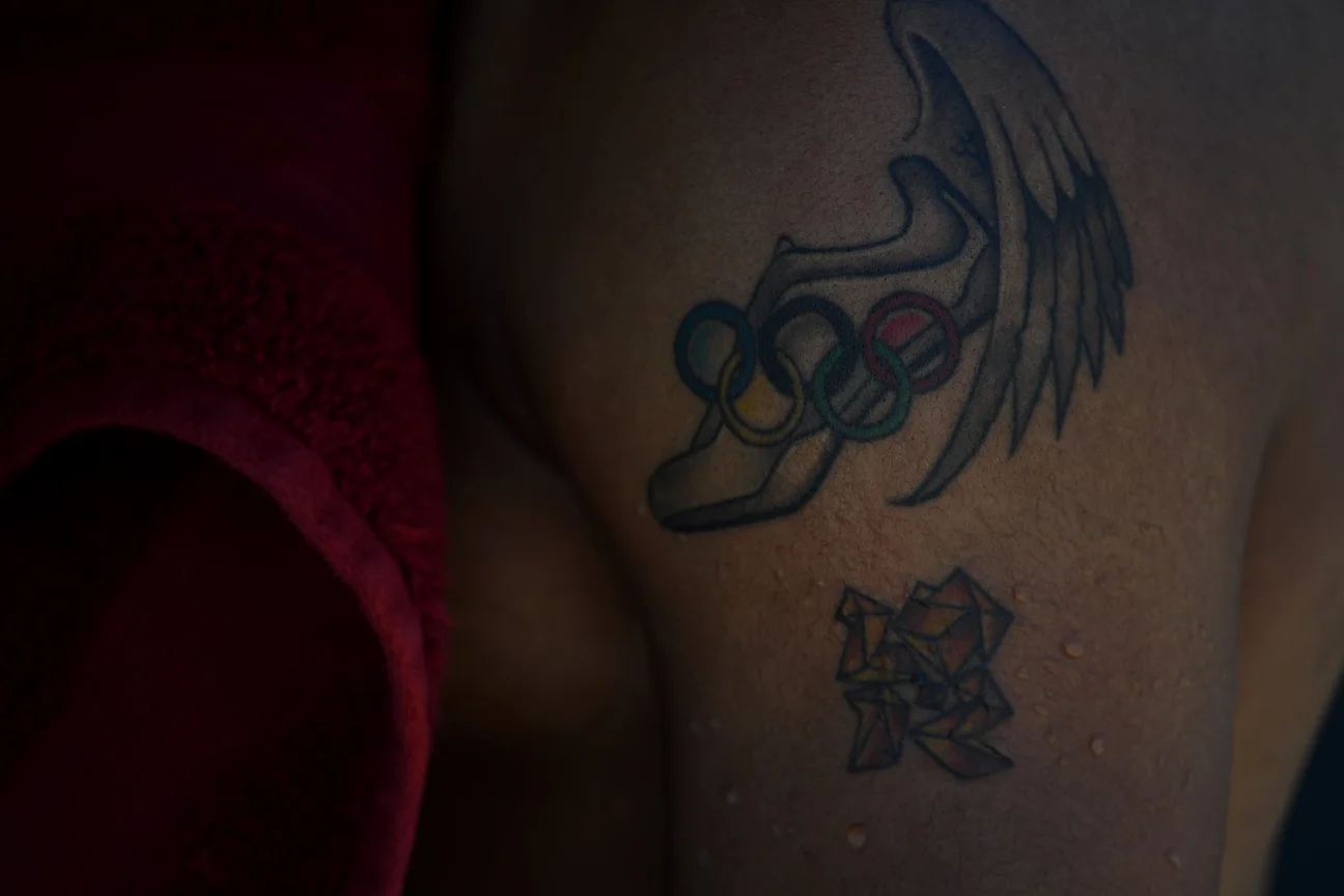 Merritt's tattoos pay tribute to his gold at the London Games in 2012 with a time of 12.92. A month later, he broke the world record in the 110 hurdles at 12.80, bettering the previous mark by seven-hundredths of a second. It was the largest drop in the record in 31 years.