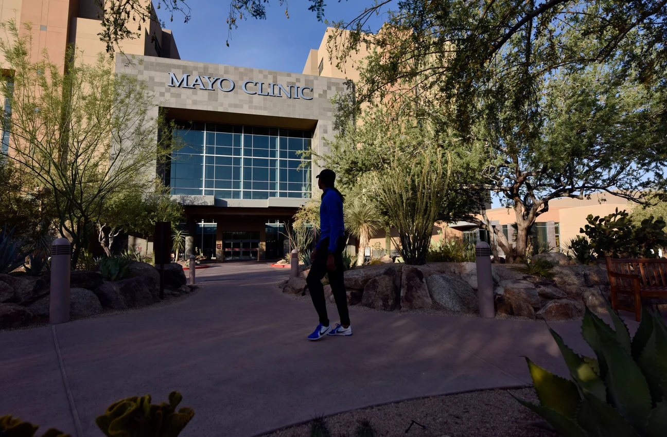 Merritt walks into the Mayo Clinic in Scottsdale, Arizona, where he received his kidney transplant. Dr. Les Thomas, who treated Merritt, is so impressed by him that he traveled to Eugene to see him compete.