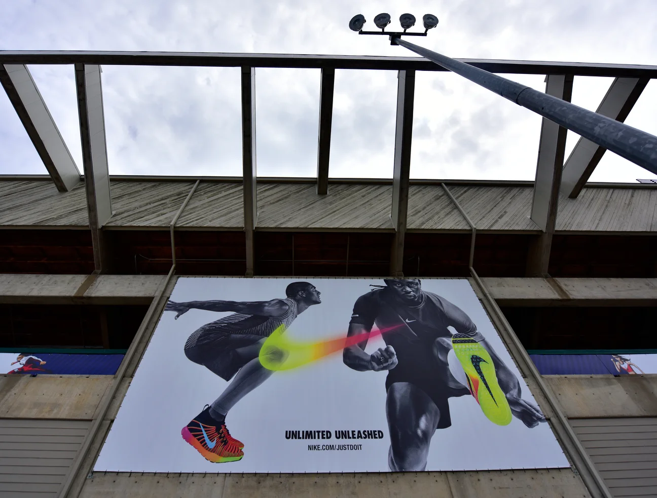 This Nike ad at Hayward Field says Merritt is "Unlimited'' and "Unleashed.'' It should also say "Undaunted by Anything. And we mean Anything!''