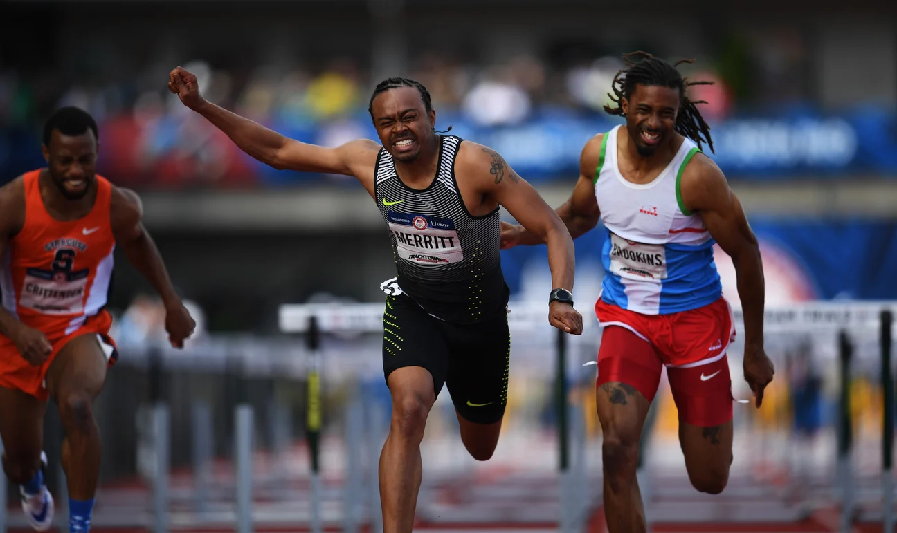 Merritt had the lead in the 110 final with just three hurdles left to the finish line.