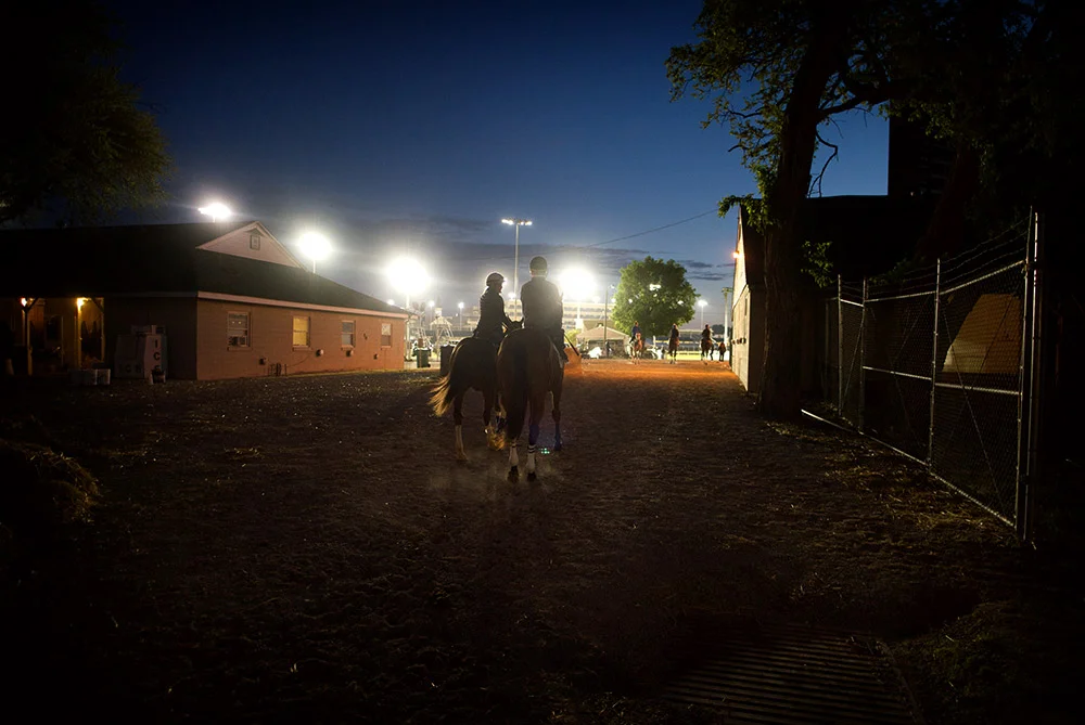 An exercise rider leads Hernandez and his horse to the track for a morning workout on Wednesday at Churchill Downs. For Hernandez, 31, horse racing is a family tradition. Brian Hernandez Sr. had a long career as a jockey at Delta Downs in southwest Louisiana, and his children Brian Jr., Colby and Courtney Hernandez all followed in their father's footsteps to work as jockeys as well.