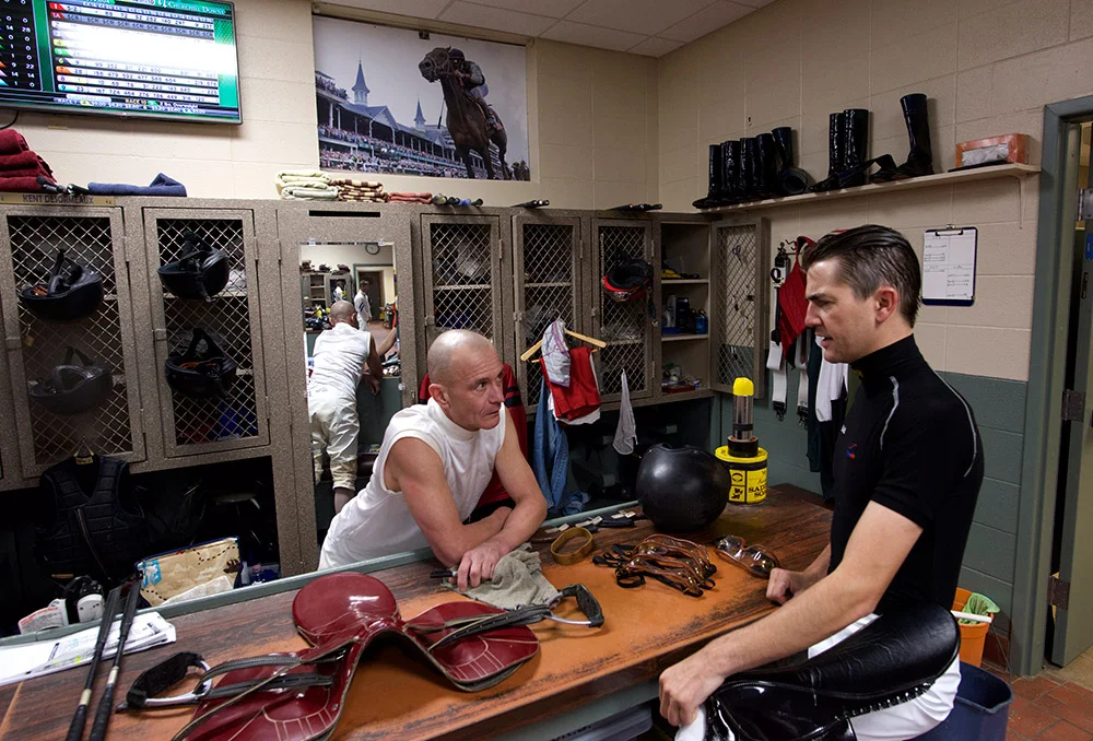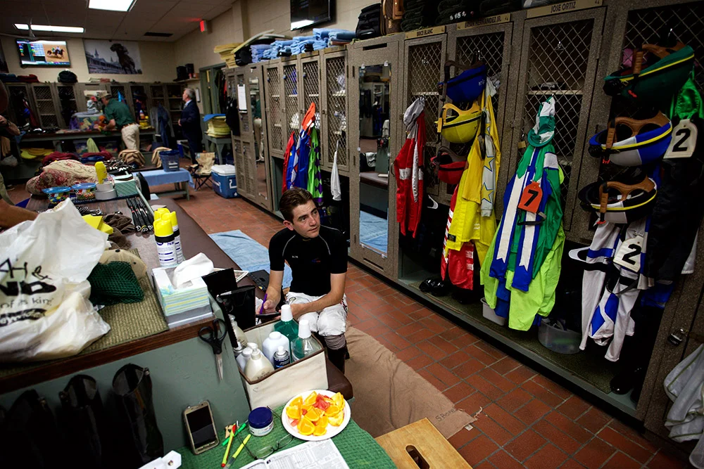 Hernandez prepares in the jockey room before a race at Churchill Downs on Tuesday. Hernandez is a rising star in this room, having earned $2.5 million on his mounts in 2017.