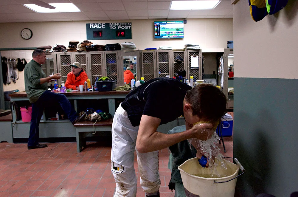 Between races, Hernandez washes his face in the jockey room at Churchill Downs on Thursday. Each jockey has his own makeshift shower bucket for cleaning mud off his face.