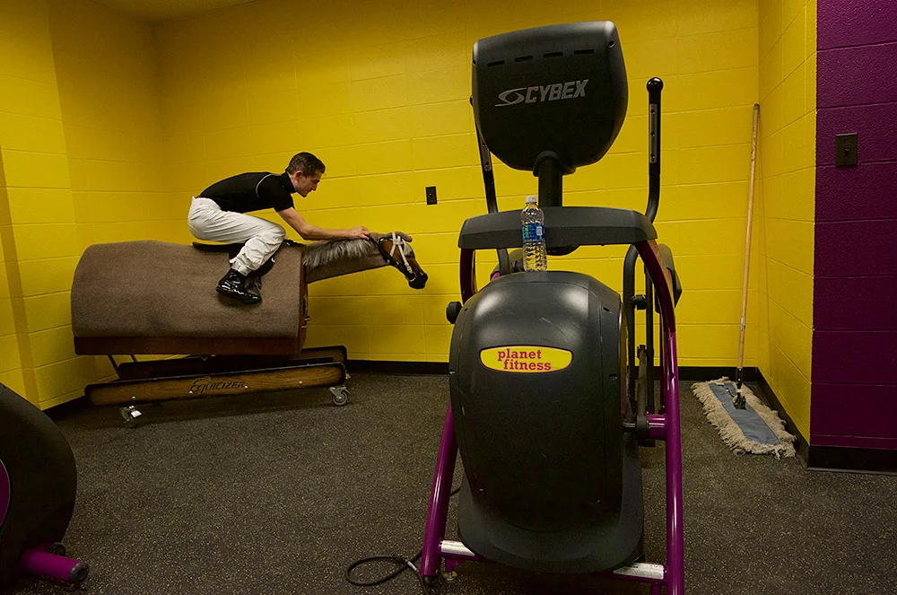Hernandez warms up on an Equicizer at Churchill Downs on Thursday. Equicizers act as a riding simulator, allowing jockeys to warm up muscles and practice technique off the horse.