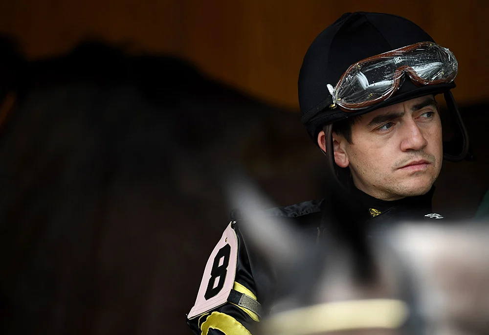Hernandez watches a replay of the Kentucky Oaks race in the jockey room on Friday. Hernandez finished eighth in the race aboard Dream Dance in 2016.
