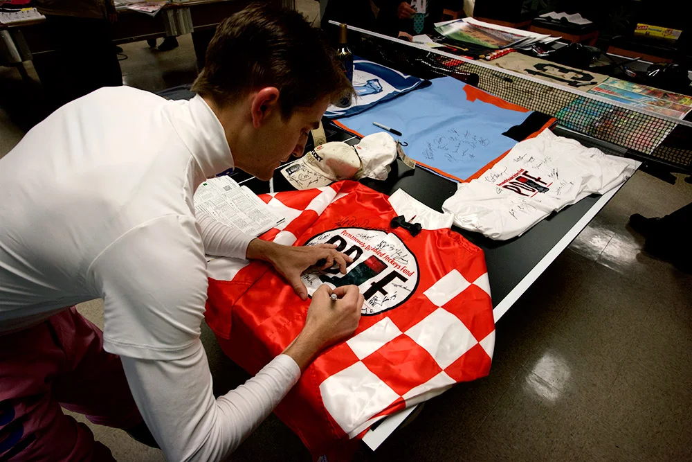 Hernandez signs jockey paraphernalia on Friday for the Permanently Disabled Jockeys Fund, which provides financial assistance to some 60 former jockeys who have suffered catastrophic on-track injuries. Since its founding in 2006, the fund has dispersed over $7 million to permanently disabled jockeys, most of whom have sustained paralysis or brain injuries.