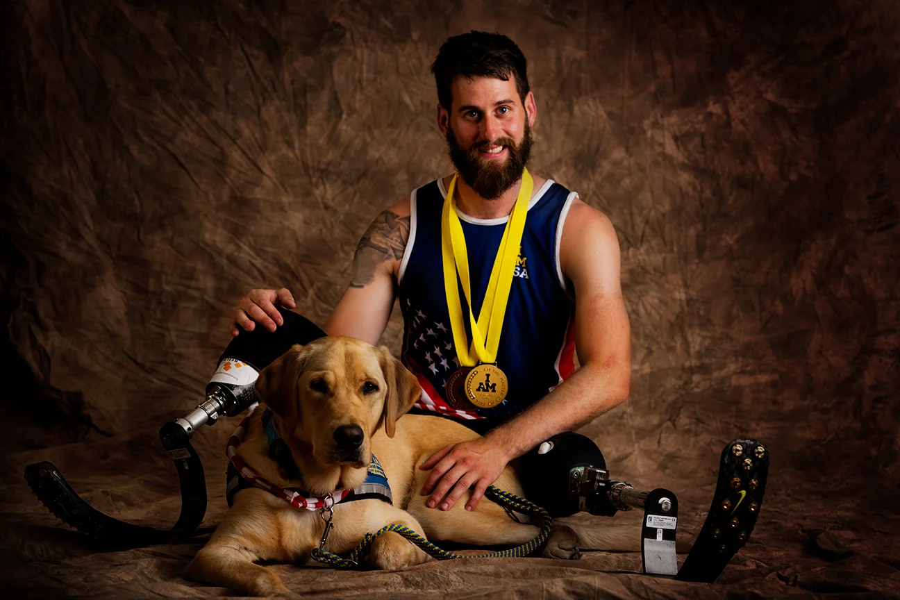 Stefan Leroy, 25, sits with his service dog, Knoxville. Leroy served in the Army and is from Santa Rosa, California, but now resides in Jupiter, Florida. He won a gold medal in sitting volleyball.