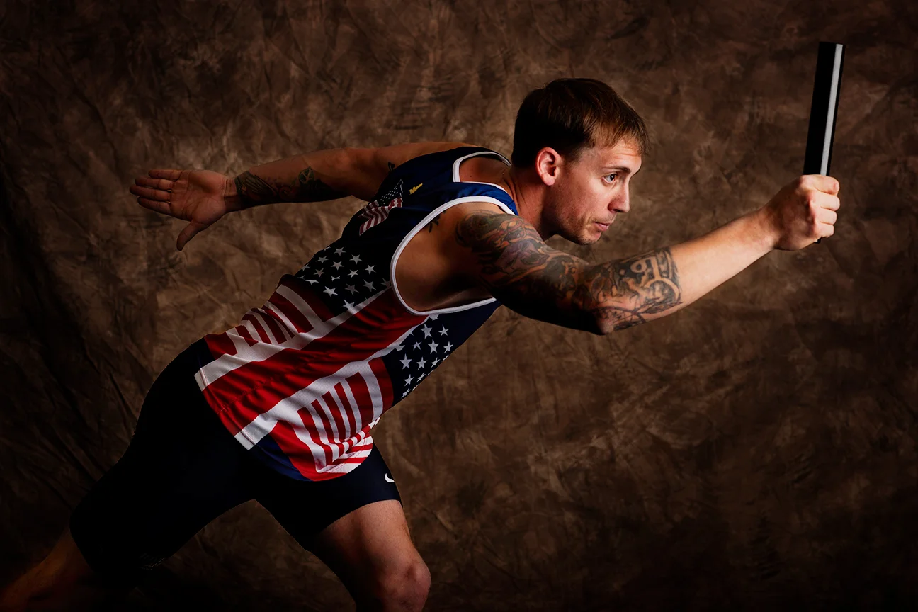 Sean Venezia, 27, is from Lafayette, Louisiana. He served in the Marine Corps and competed in track and cycling. Venezia ran the first leg for the gold medal-winning 4x100-meter relay team.