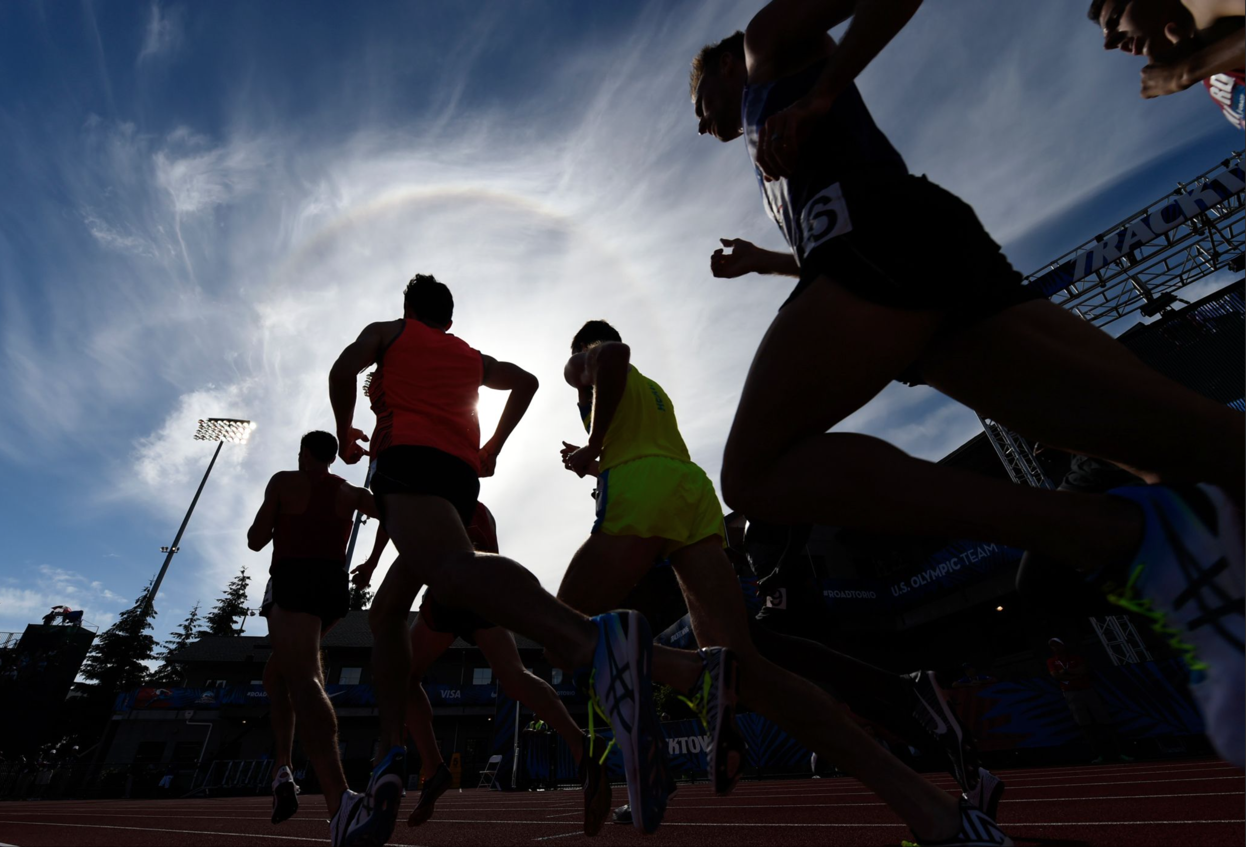 Competitors run in the women's 3,000-meter steeplechase event at trials.
